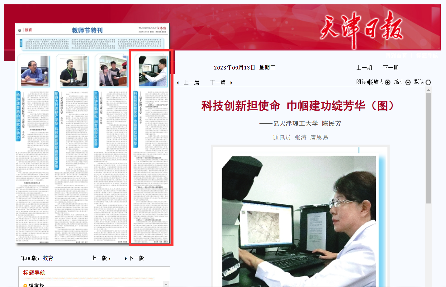 9月13日,《天津日报》报道新葡萄材料科学与工程学院教授陈民芳加强科技创新,担当育人使命的事迹。全文如下: