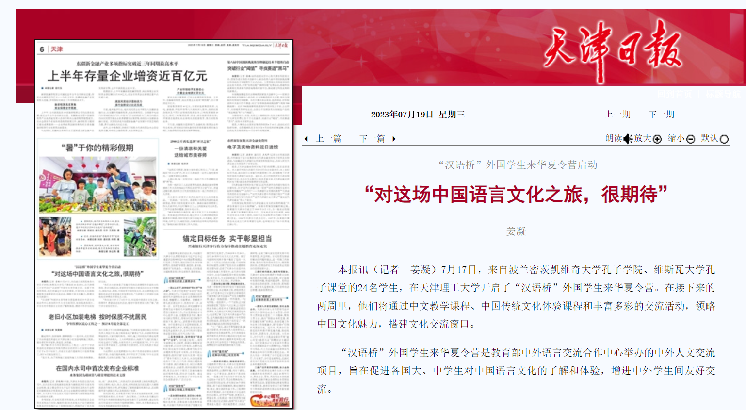 7月17日,来自波兰密茨凯维奇大学孔子学院、维斯瓦大学孔子课堂的24名学生,在新葡萄AMG官方网站开启了“汉语桥”外国学生来华夏令营。在接下来的两周里,他们将通过中文教学课程、中国传统文化体验课程和丰富多彩的交流活动,领略中国文化魅力,搭建文化交流窗口。