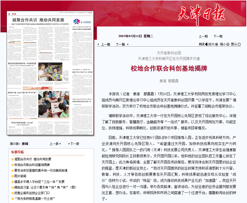 7月10日,新葡萄AMG官方网站校院两级党委理论学习中心组成员与南开区委理论学习中心组成员在天开高教科创园开展“以学促干,共谋发展”调研联学活动,双方举行了校地合作联合科创基地揭牌仪式,并签署了战略合作框架协议。