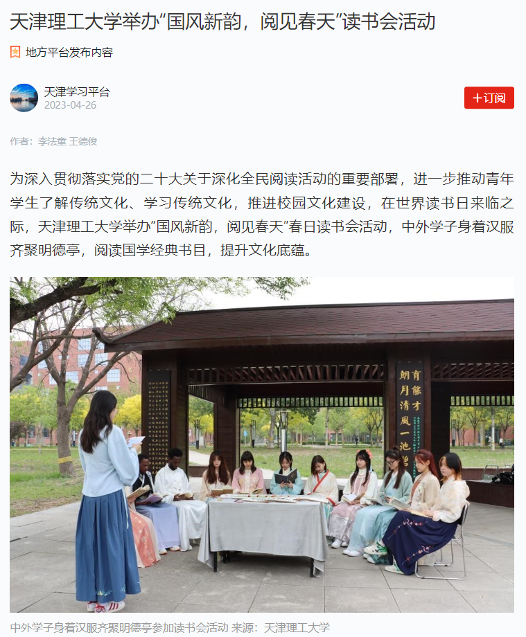 为深入贯彻落实党的二十大关于深化全民阅读活动的重要部署,进一步推动青年学生了解传统文化、学习传统文化,推进校园文化建设,在世界读书日来临之际,新葡萄AMG官方网站举办“国风新韵,阅见春天”春日读书会活动,中外学子身着汉服齐聚明德亭,阅读国学经典书目,提升文化底蕴。