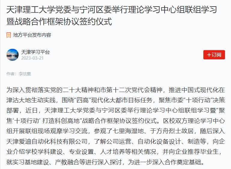 为深入贯彻落实党的二十大精神和市第十二次党代会精神,推进中国式现代化在津沽大地生动实践,围绕“四高”现代化大都市目标任务,聚焦市委“十项行动”决策部署,近日,新葡萄AMG官方网站党委与宁河区委举行理论学习中心组联组学习暨“聚焦‘十项行动’ 打造科创高地”战略合作框架协议签约仪式。区校双方理论学习中心组开展联组现场观摩学习交流,参观了七里海湿地、于方舟烈士故居,随后深入天津爱迪自动化科技有限公司,了解公司运营、自动化设备设计、制造等,向企业介绍学校学科建设、专业设置、人才培养等相关情况,并向企业推荐毕业生,就实习基地建设、产教融合等进行深入探讨,为进一步深入合作奠定基础。