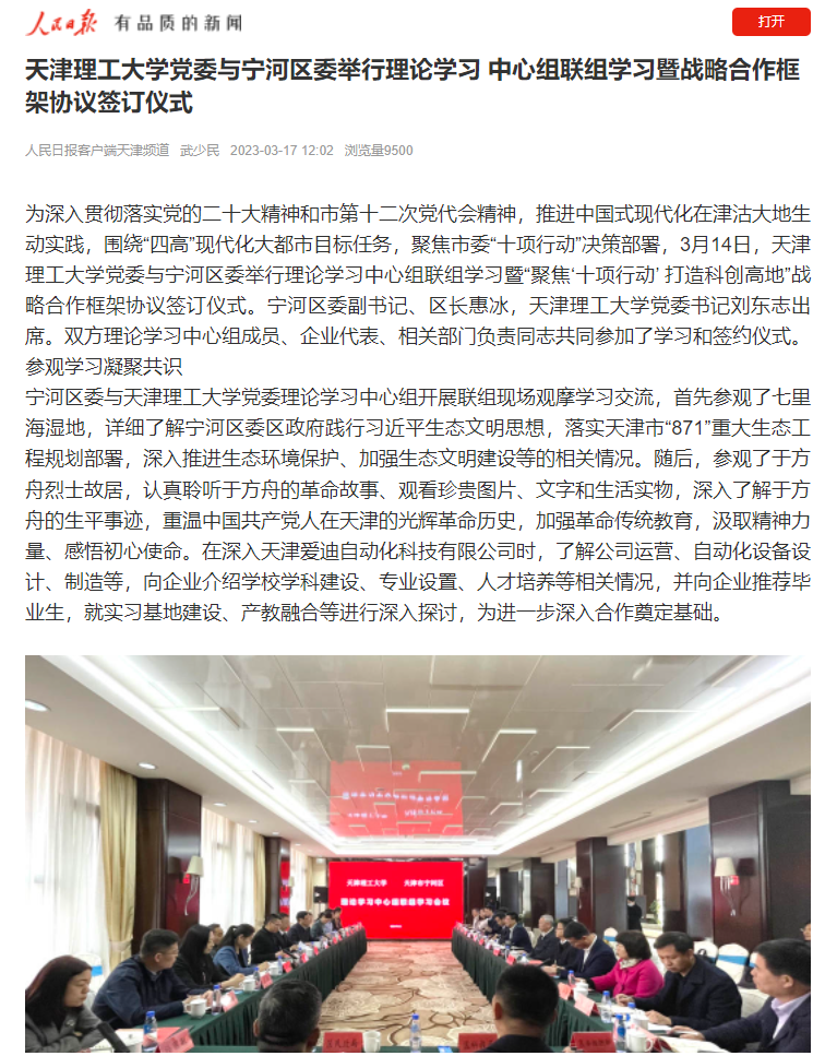 为深入贯彻落实党的二十大精神和市第十二次党代会精神,推进中国式现代化在津沽大地生动实践,围绕“四高”现代化大都市目标任务,聚焦市委“十项行动”决策部署,3月14日,新葡萄AMG官方网站党委与宁河区委举行理论学习中心组联组学习暨“聚焦‘十项行动’ 打造科创高地”战略合作框架协议签订仪式。宁河区委副书记、区长惠冰,新葡萄AMG官方网站党委书记刘东志出席。双方理论学习中心组成员、企业代表、相关部门负责同志共同参加了学习和签约仪式。