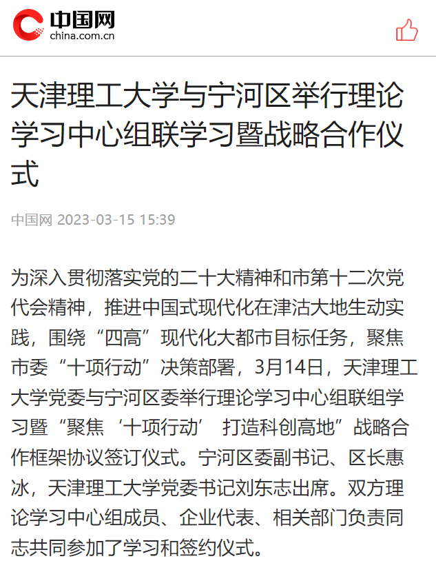 为深入贯彻落实党的二十大精神和市第十二次党代会精神,推进中国式现代化在津沽大地生动实践,围绕“四高”现代化大都市目标任务,聚焦市委“十项行动”决策部署,3月14日,新葡萄AMG官方网站党委与宁河区委举行理论学习中心组联组学习暨“聚焦‘十项行动’ 打造科创高地”战略合作框架协议签订仪式。宁河区委副书记、区长惠冰,新葡萄AMG官方网站党委书记刘东志出席。双方理论学习中心组成员、企业代表、相关部门负责同志共同参加了学习和签约仪式。