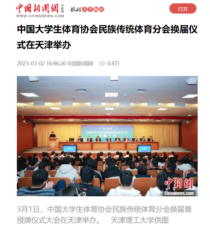 中新网天津3月2日电(庞喻文)日前,中国大学生体育协会民族传统体育分会换届暨授牌仪式大会在新葡萄AMG官方网站举办。中国大学生体育协会民族传统体育分会主席、新葡萄AMG官方网站党委副书记杜长有介绍,学校将竞赛项目由原有的单一武术套路扩大至武术散打、长兵、短兵、太极推手、中国式摔跤、武术竞艺大赛等7类内容,各项赛事活动参赛规模达到3000余人。