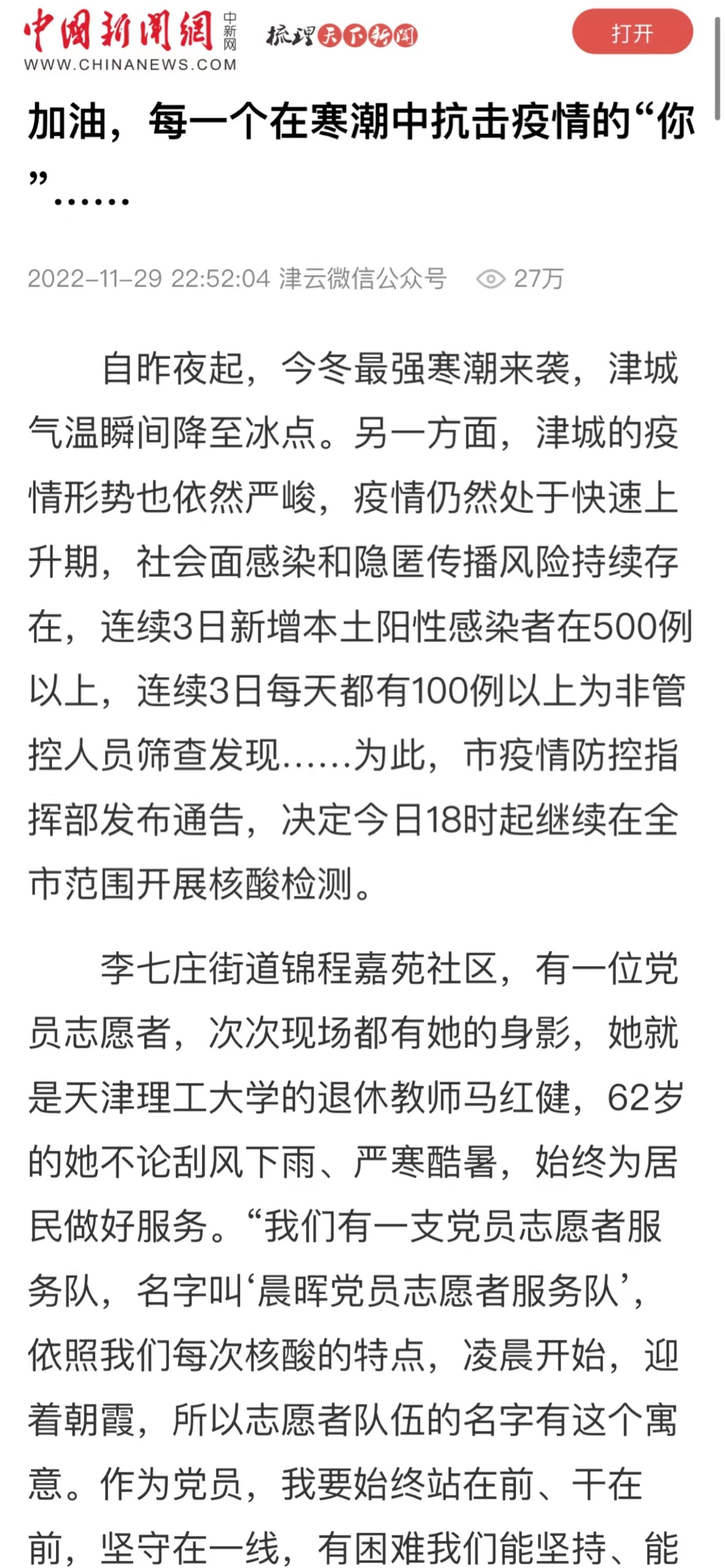 11月29日,中国新闻网报道新葡萄退休教师马红健不论刮风下雨、严寒酷暑,始终活跃在李七庄街道锦程嘉苑社区党员志愿者队伍中,始终为居民做好服务,内容如下: