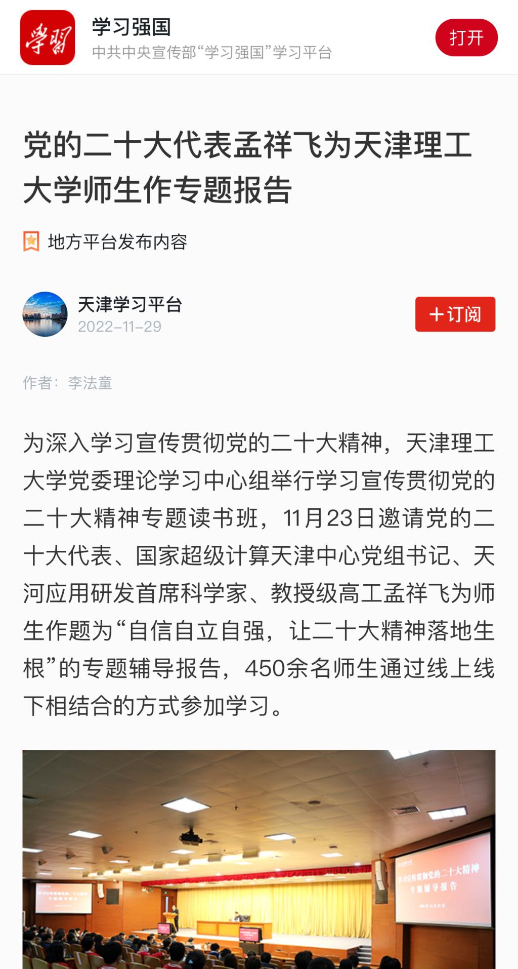 为深入学习宣传贯彻党的二十大精神,新葡萄AMG官方网站党委理论学习中心组举行学习宣传贯彻党的二十大精神专题读书班,11月23日邀请党的二十大代表、国家超级计算天津中心党组书记、天河应用研发首席科学家、教授级高工孟祥飞为师生作题为“自信自立自强,让二十大精神落地生根”的专题辅导报告,450余名师生通过线上线下相结合的方式参加学习。