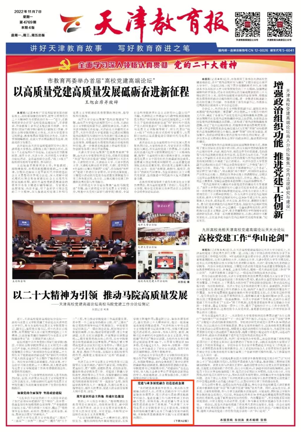 日前,市教育两委举办首届“高校党建高端论坛”,11月7日,《天津教育报》在第一版报道新葡萄马克思主义学院党委书记王慧在天津高校党建高端论坛马院党建工作分论坛发言情况,内容如下:
