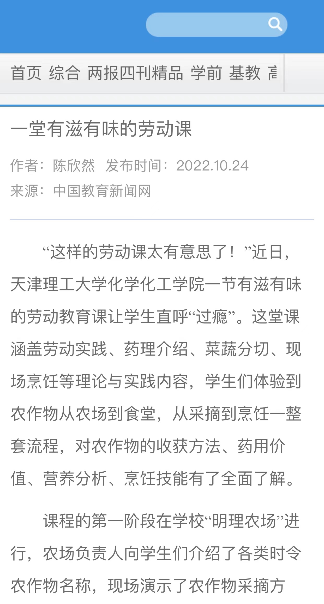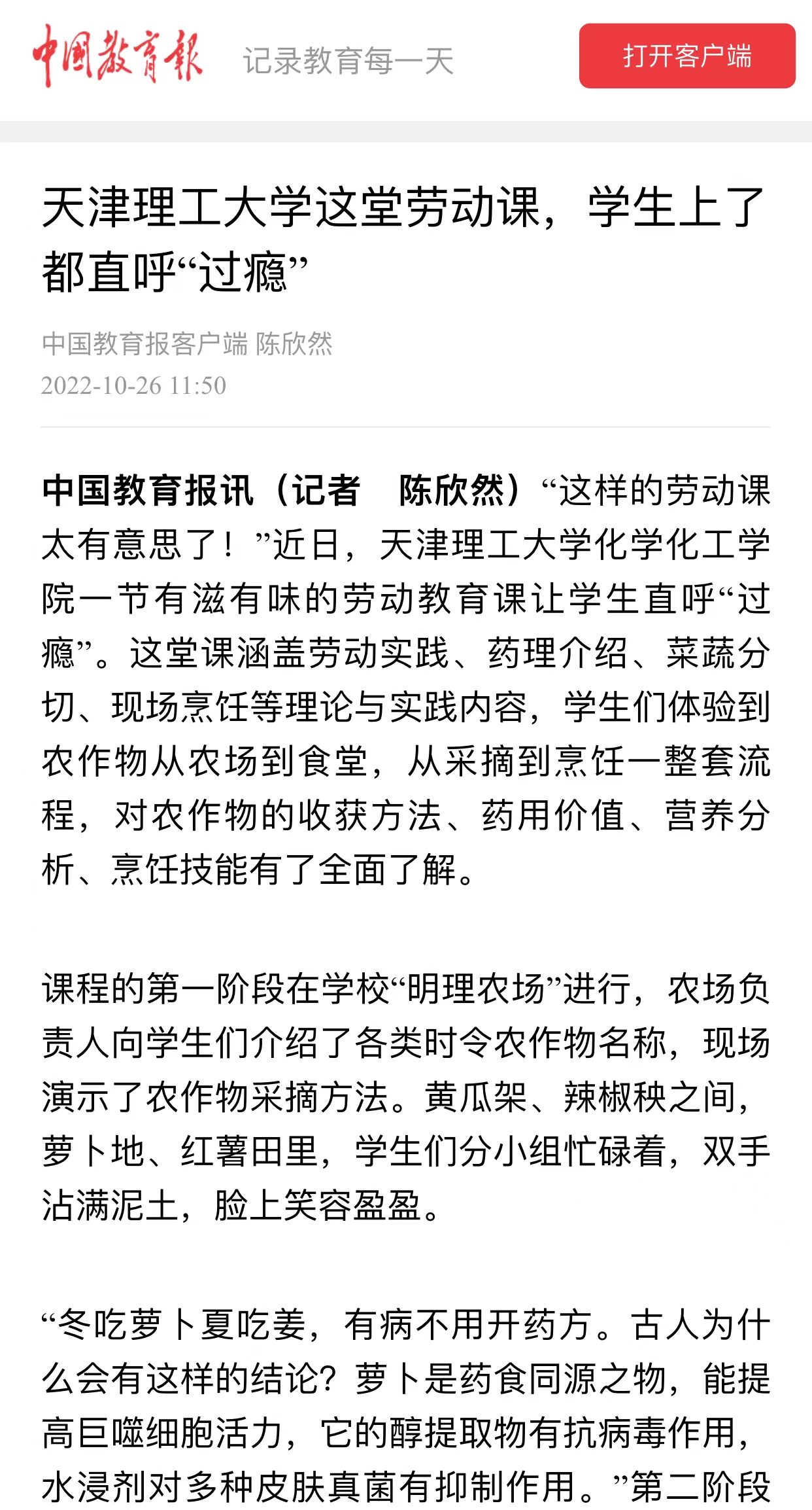 10月24日,《中国教育报》、中国教育新闻网报道新葡萄化学化工学院创新劳动教育课,课程涵盖劳动实践、药理介绍、菜蔬分切、现场烹饪等理论与实践内容,学生们体验到农作物从农场到食堂,从采摘到烹饪一整套流程,对农作物的收获方法、药用价值、营养分析、烹饪技能有了全面了解,内容如下: