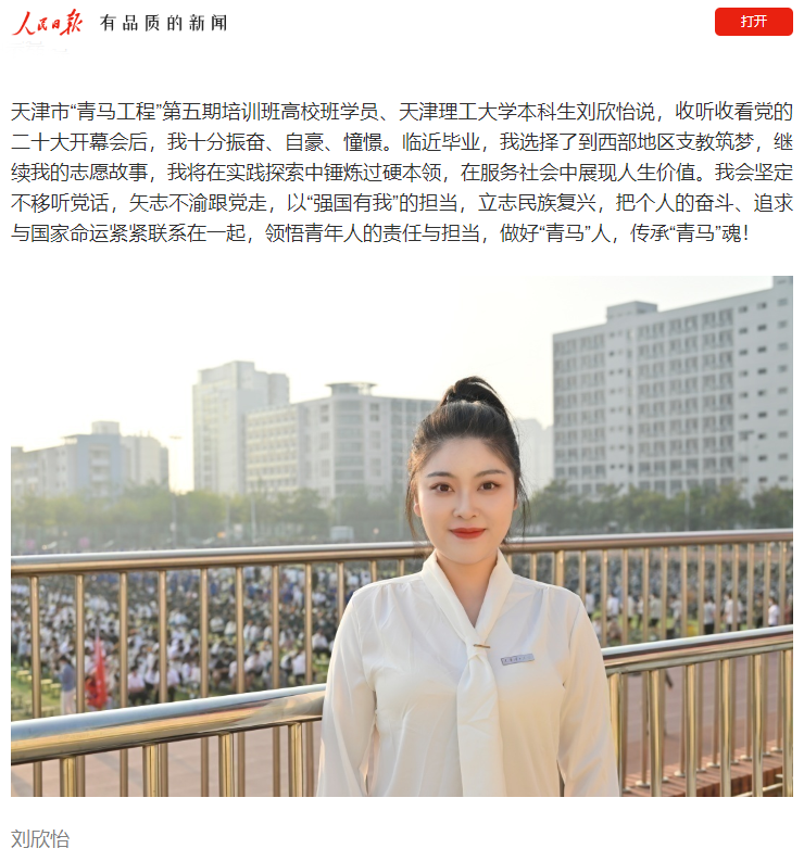 天津市“青马工程”第五期培训班高校班学员、新葡萄AMG官方网站本科生刘欣怡说,收听收看党的二十大开幕会后,我十分振奋、自豪、憧憬。临近毕业,我选择了到西部地区支教筑梦,继续我的志愿故事,我将在实践探索中锤炼过硬本领,在服务社会中展现人生价值。我会坚定不移听党话,矢志不渝跟党走,以“强国有我”的担当,立志民族复兴,把个人的奋斗、追求与国家命运紧紧联系在一起,领悟青年人的责任与担当,做好“青马”人,传承“青马”魂!