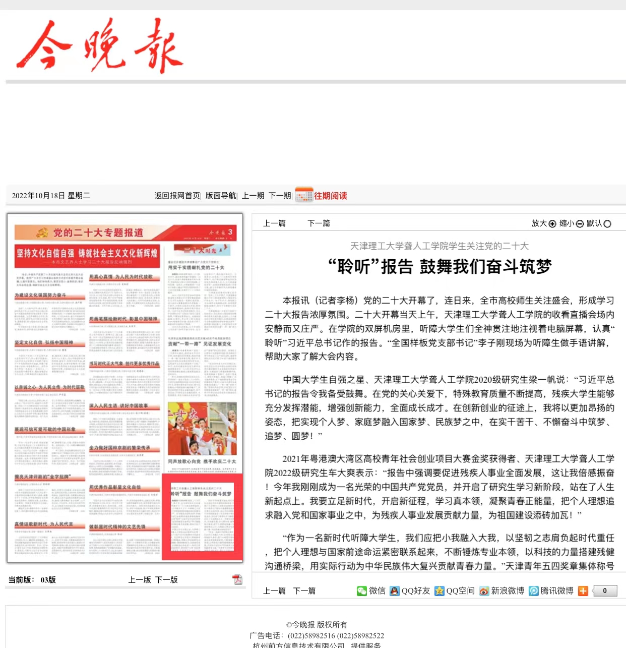 10月18日,《今晚报》第3版报道新葡萄聋人工学院学生关注中国共产党第二十次全国代表大会情况,内容如下: