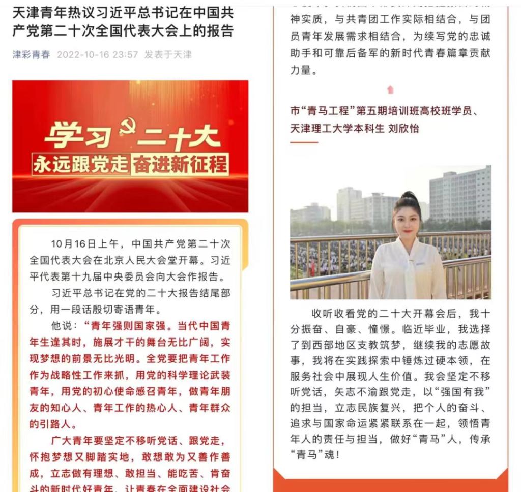 10月16日,津彩青春报道市“青马工程”第五期培训班高校班学员、新葡萄语言文化学院本科生刘欣怡热议党的二十大报告情况,内容如下: