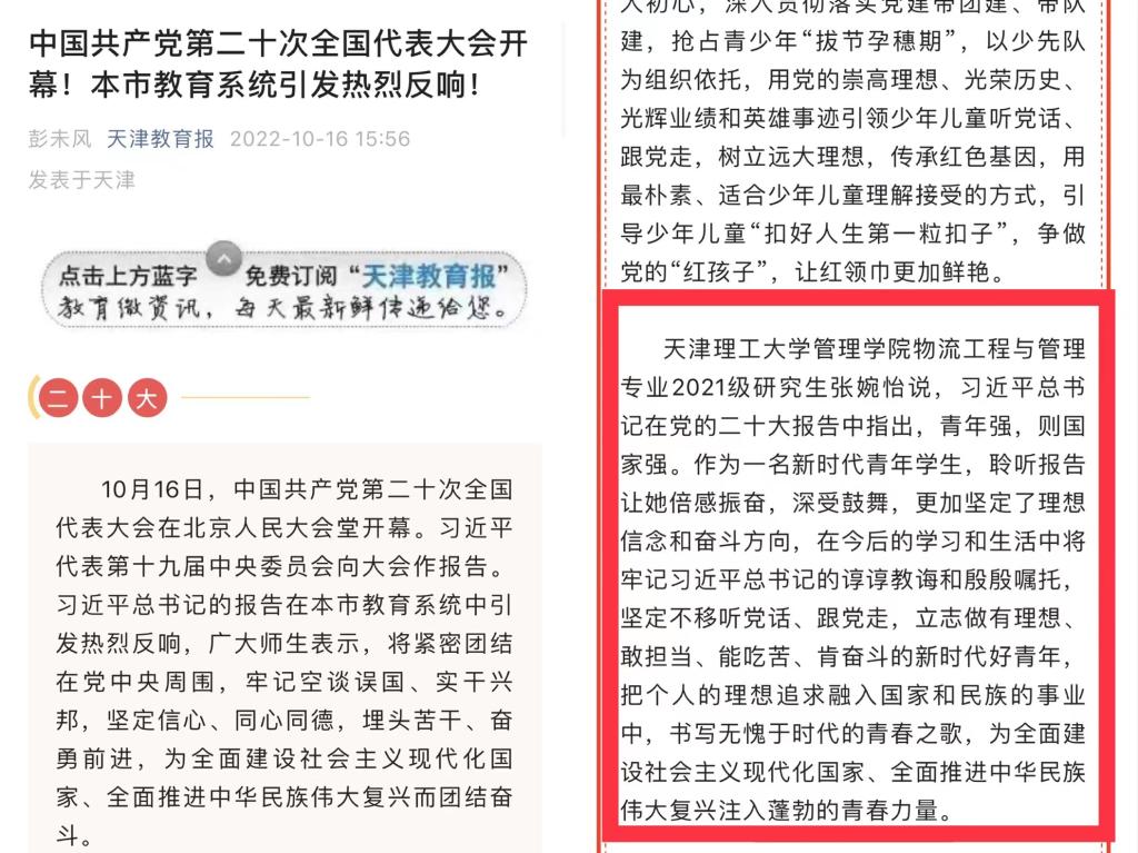 10月16日,中国共产党第二十次全国代表大会在北京人民大会堂开幕。习近平代表第十九届中央委员会向大会作报告。习近平总书记的报告在本市教育系统中引发热烈反响。当日,天津教育报公众号报道新葡萄管理学院物流工程与管理专业2021级研究生张婉怡热议党的二十大报告情况,内容如下: