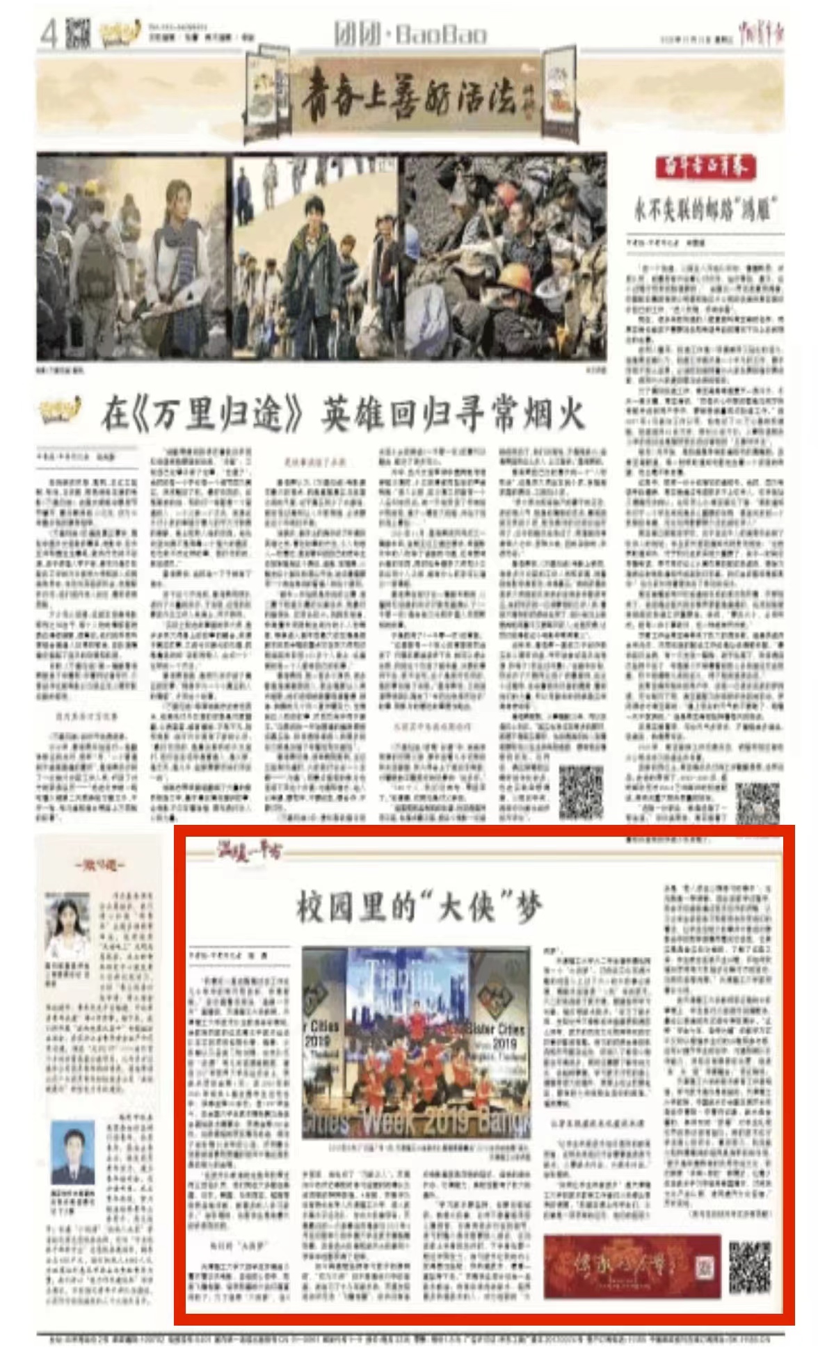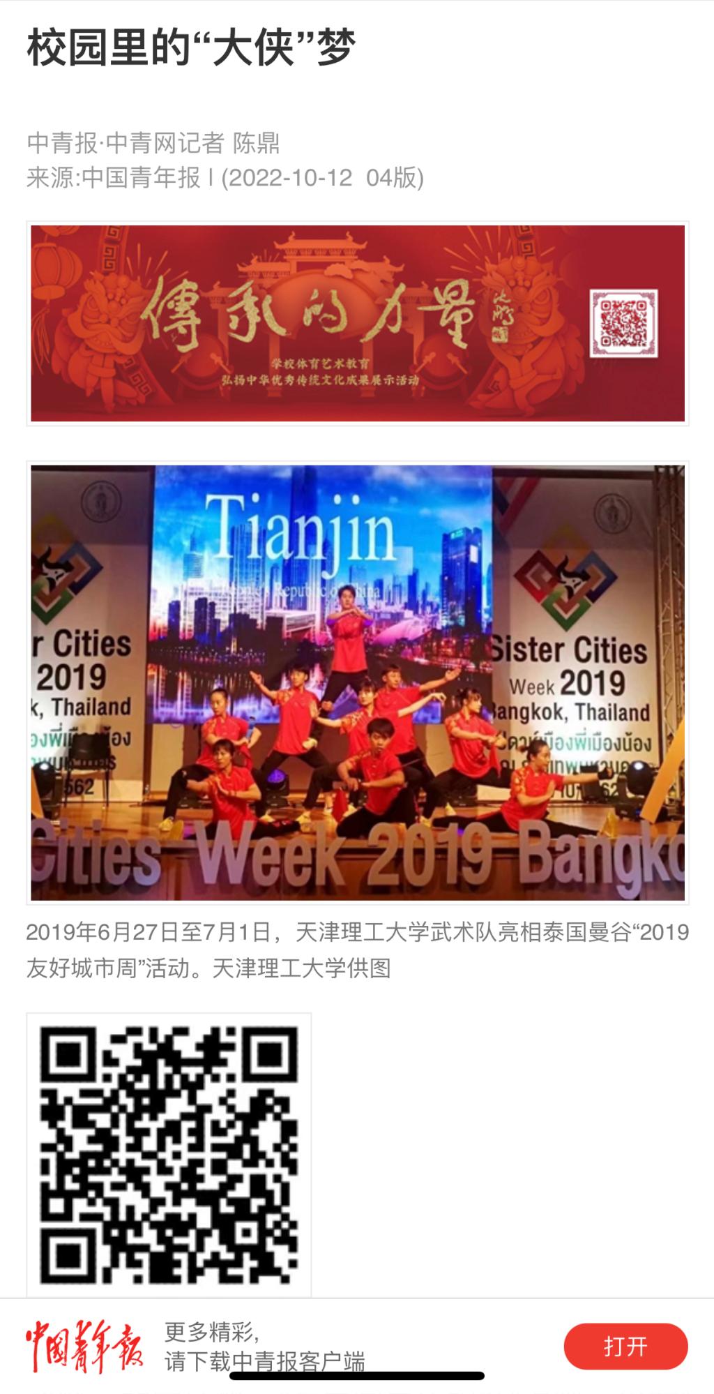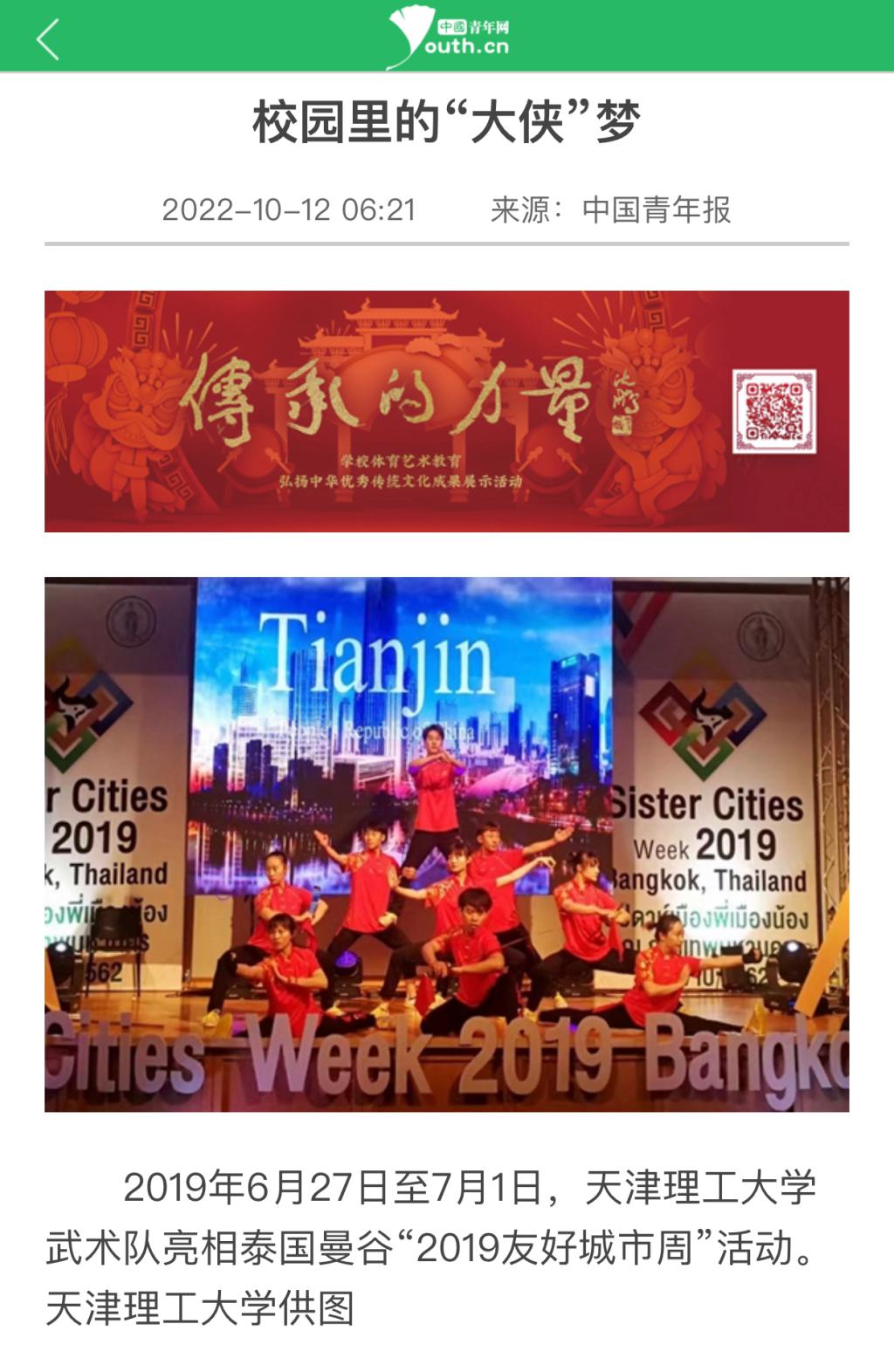 10月12日《中国青年报》在第4版“温暖一平方”栏目报道新葡萄探索“体育+思政”新模式,促进“体”与“育”深度融合,让青年学生在武术学习中培养家国情怀,坚定“四个自信”,内容如下: