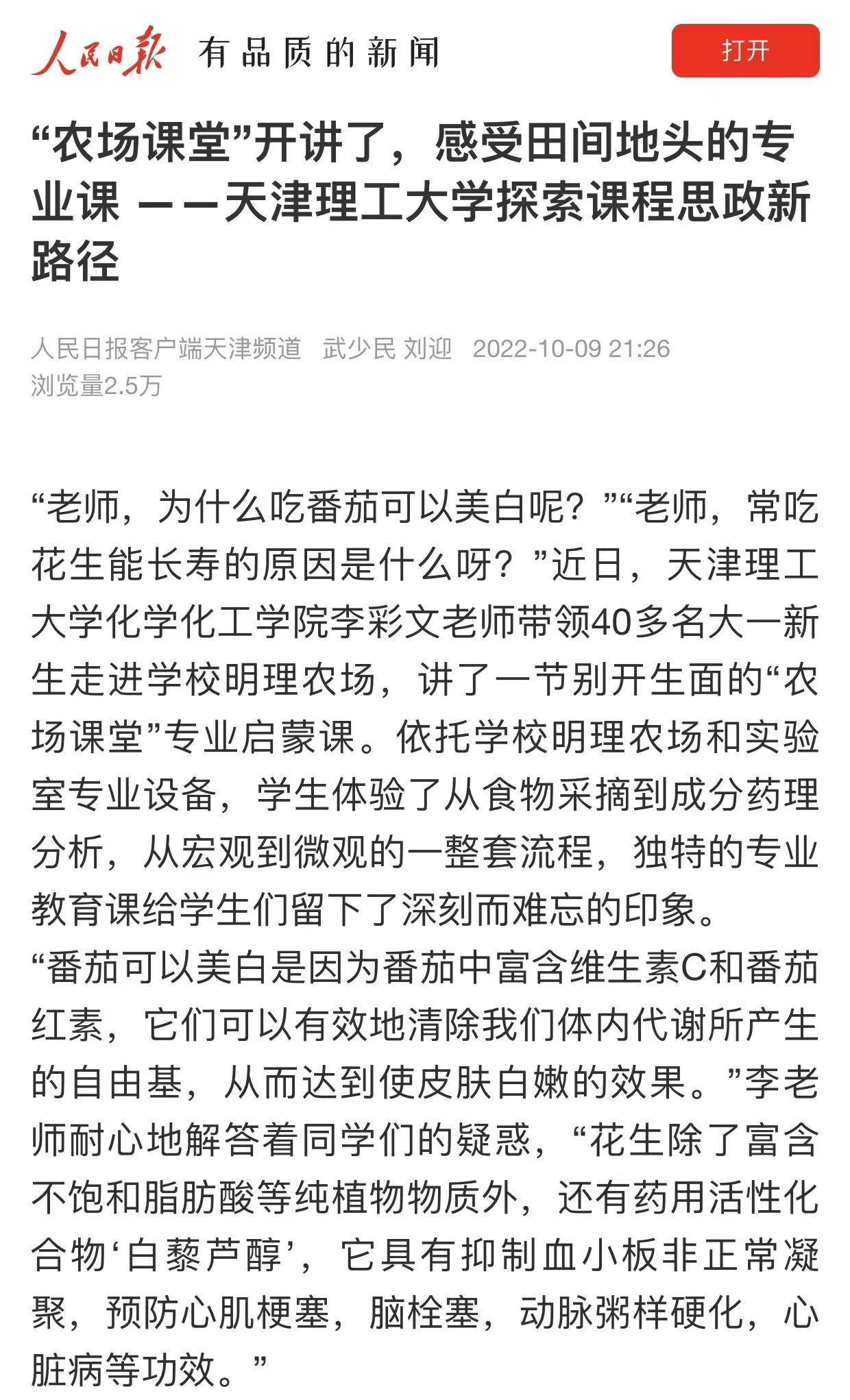 “老师,为什么吃番茄可以美白呢?”“老师,常吃花生能长寿的原因是什么呀?”近日,新葡萄AMG官方网站化学化工学院李彩文老师带领40多名大一新生走进学校明理农场,讲了一节别开生面的“农场课堂”专业启蒙课。依托学校明理农场和实验室专业设备,学生体验了从食物采摘到成分药理分析,从宏观到微观的一整套流程,独特的专业教育课给学生们留下了深刻而难忘的印象。