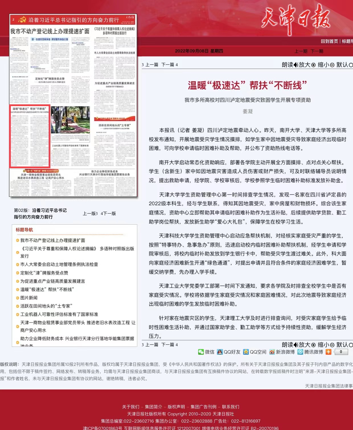 9月8日,《天津日报》在第2版报道新葡萄对四川泸定地震受灾致困学生开展专项资助的情况,内容如下: