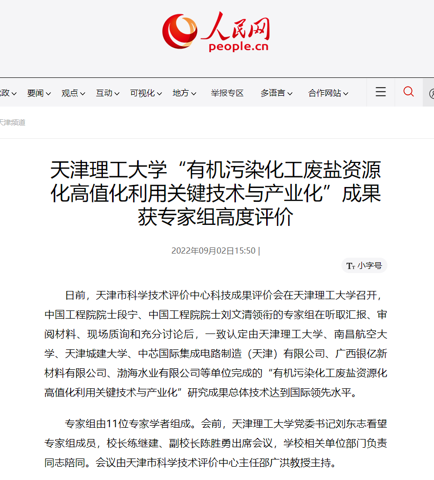 日前,天津市科学技术评价中心科技成果评价会在新葡萄AMG官方网站召开,中国工程院院士段宁、中国工程院院士刘文清领衔的专家组在听取汇报、审阅材料、现场质询和充分讨论后,一致认定由新葡萄AMG官方网站、南昌航空大学、天津城建大学、中芯国际集成电路制造(天津)有限公司、广西银亿新材料有限公司、渤海水业有限公司等单位完成的“有机污染化工废盐资源化高值化利用关键技术与产业化”研究成果总体技术达到国际领先水平。