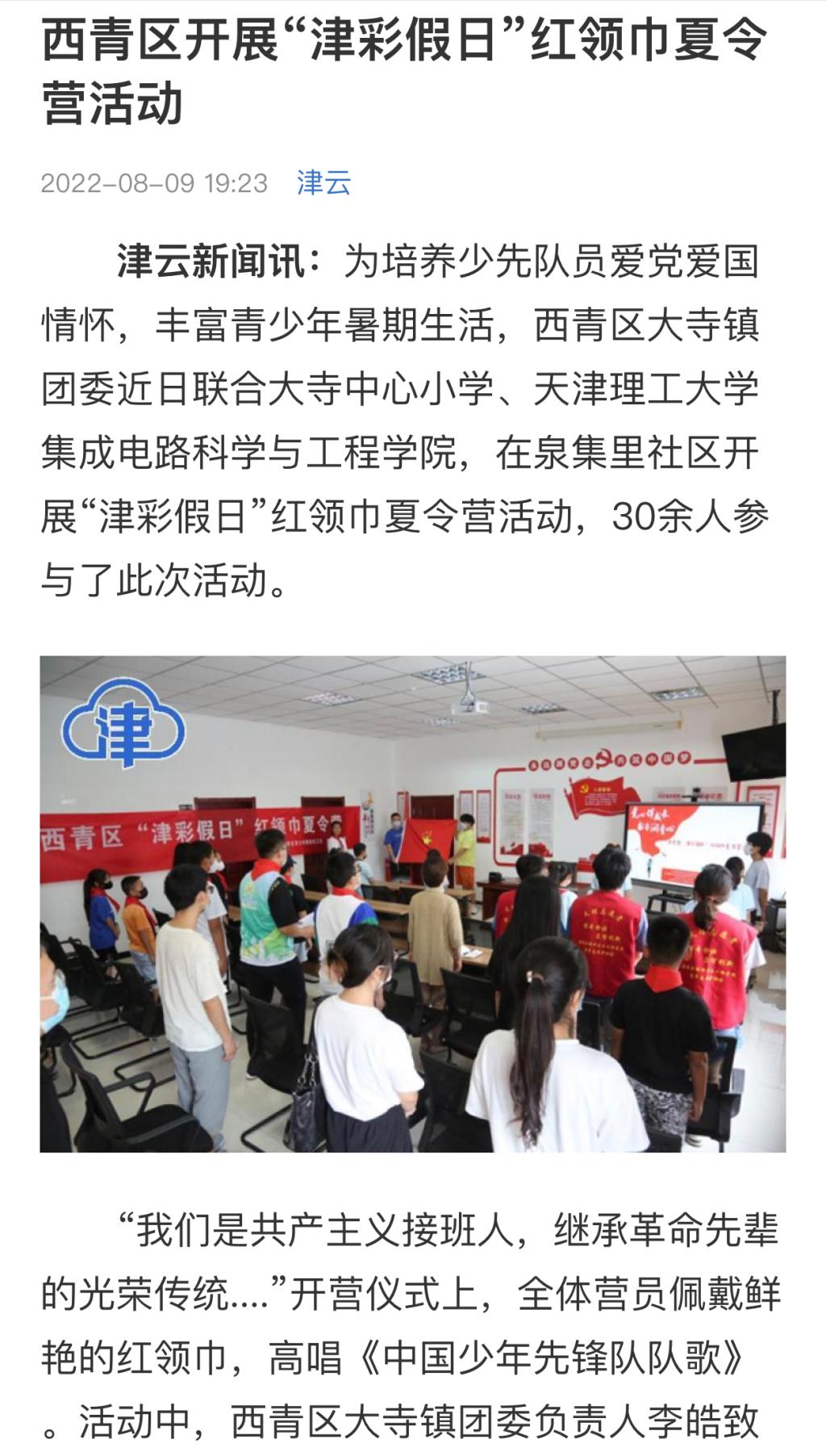 日前,津云客户端报道新葡萄集成电路科学与工程学院联合西青区大寺镇团委、大寺中心小学在泉集里社区开展“津彩假日”红领巾夏令营活动,培养少先队员爱党爱国情怀,丰富青少年暑期生活,内容如下: