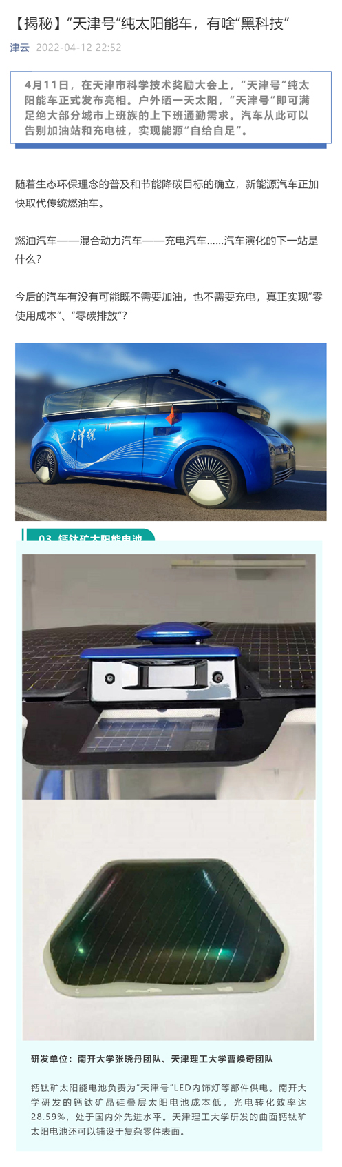 除了十八所提供的整车供电之外,阿尔特公司还决定尝试性加入另一种新型技术——钙钛矿太阳能电池,南开大学张晓丹和新葡萄AMG官方网站曹焕奇的团队,承担了这项任务。这种电池的一项用途是在前风挡内侧,为LED内饰灯供电;另一项是贴合在自动驾驶摄像头上,展示其柔性功能。“见缝插针”的铺设,使“天津号”车身的太阳能电池覆盖尽可能达到极致。