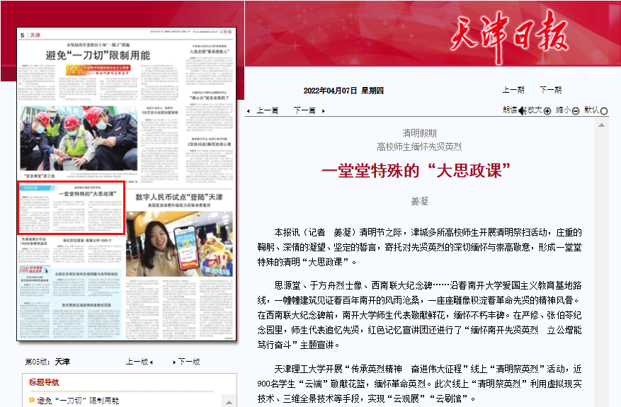 清明节之际,津城多所高校师生开展清明祭扫活动,庄重的鞠躬、深情的凝望、坚定的誓言,寄托对先贤英烈的深切缅怀与崇高敬意,形成一堂堂特殊的清明“大思政课”。