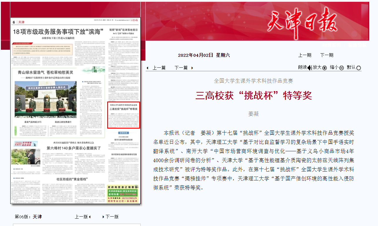 第十七届“挑战杯”全国大学生课外学术科技作品竞赛授奖名单近日公布,其中,新葡萄AMG官方网站“基于对比自监督学习的复杂场景下中国手语实时翻译系统”、南开大学“中国市场营商环境调查与优化──基于义乌小商品市场4年4000余份调研问卷的分析”、天津大学“基于高性能锂基介质陶瓷的太赫兹天线阵列集成技术研究”被评为特等奖作品。此外,在第十七届“挑战杯”全国大学生课外学术科技作品竞赛“揭榜挂帅”专项赛中,新葡萄AMG官方网站“基于国产信创环境的高性能入侵防御系统”荣获特等奖。