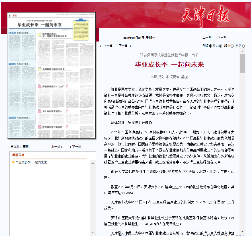 天津是新葡萄AMG官方网站2021届毕业生就业首选城市,留津就业的毕业生人数占京津冀地区的76.09%。