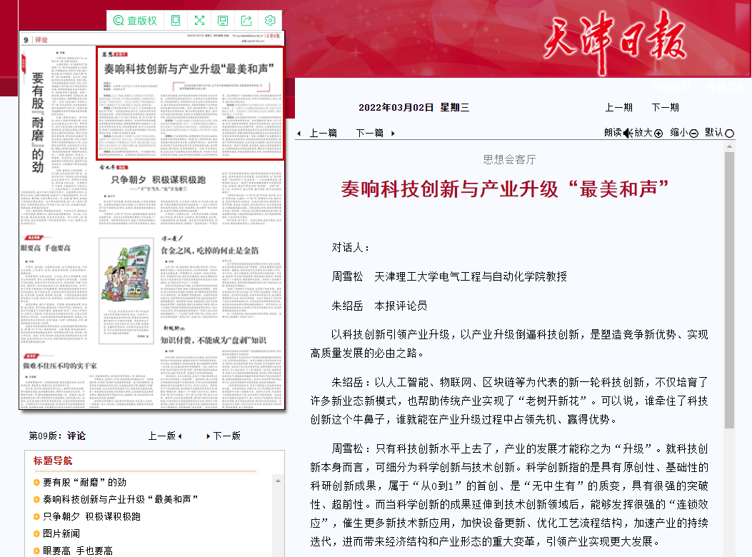 周雪松:企业是联结科技进步、产业发展和经济增长的纽带,也是创新的重要主体。企业掌握资金、技术、人才、管理、知识、数据等创新要素,有着天然的创新动力,我们应该创造更好条件让企业发挥作用。近年来,天津持续壮大科技型企业底盘,统筹推进高新技术企业倍增行动和高成长企业梯度培育,雏鹰、瞪羚等各类高新技术企业逐渐成长为引领行业进步的关键力量。同时,还围绕产业发展重点任务,聚焦企业创新需求,积极整合国家和我市优质资源,推动产学研用深度融合,让企业成为关键核心技术攻关的重要参与者。结合产业需要、企业需求,健全公共科技服务平台,完善科技重大专项实施机制等,都是为了推动企业成为创新要素集成、科技成果转化的生力军,让创新创造源泉充分涌流。
