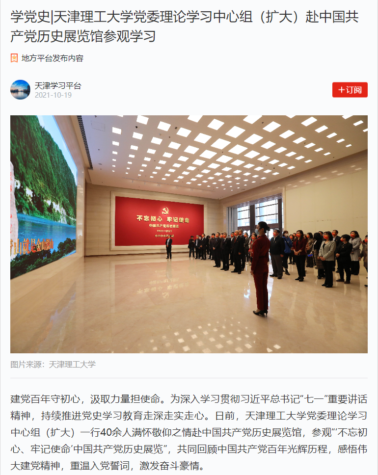 建党百年守初心,汲取力量担使命。为深入学习贯彻习近平总书记“七一”重要讲话精神,持续推进党史学习教育走深走实走心。日前,新葡萄AMG官方网站党委理论学习中心组(扩大)一行40余人满怀敬仰之情赴中国共产党历史展览馆,参观“‘不忘初心、牢记使命’中国共产党历史展览”,共同回顾中国共产党百年光辉历程,感悟伟大建党精神,重温入党誓词,激发奋斗豪情。