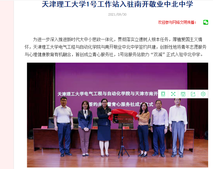 为进一步深入推进新时代大中小思政一体化,贯彻落实立德树人根本任务,厚植爱国主义情怀,新葡萄AMG官方网站电气工程与自动化学院与南开敬业中北中学签约共建,创新性地将青年志愿服务与心理健康教育有机融合,首创成立青心服务社,1号站服务站助力“双减”正式入驻中北中学。