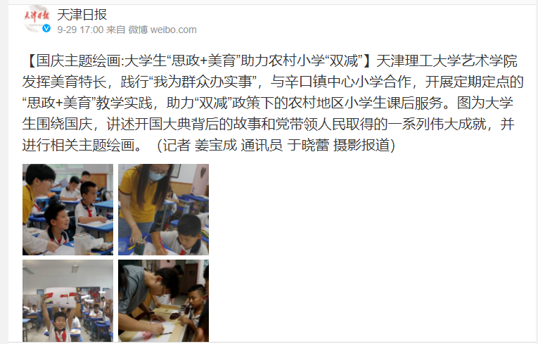 新葡萄AMG官方网站艺术学院发挥美育特长,践行“我为群众办实事”,与辛口镇中心小学合作,开展定期定点的“思政+美育”教学实践,助力“双减”政策下的农村地区小学生课后服务。图为大学生围绕国庆,讲述开国大典背后的故事和党带领人民取得的一系列伟大成就,并进行相关主题绘画。