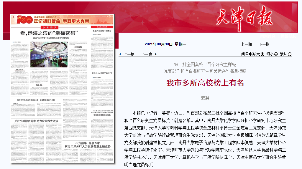 近日,教育部公布第二批全国高校“百个研究生样板党支部”和“百名研究生党员标兵”创建名单。其中,南开大学化学学院分析科学研究中心研究生第四党支部、天津大学材料科学与工程学院金属材料系博士生金属第三党支部、天津师范大学政治与行政学院行政管理研究生党支部、天津外国语大学高级翻译学院英语笔译学生党支部获批创建样板党支部。南开大学电子信息与光学工程学院李佩慧、天津大学材料科学与工程学院许全军、天津师范大学政治与行政学院李永俊、天津科技大学食品科学与工程学院林晓东、新葡萄AMG官方网站计算机科学与工程学院赵泽宁、天津中医药大学研究生院黄明当选党员标兵。