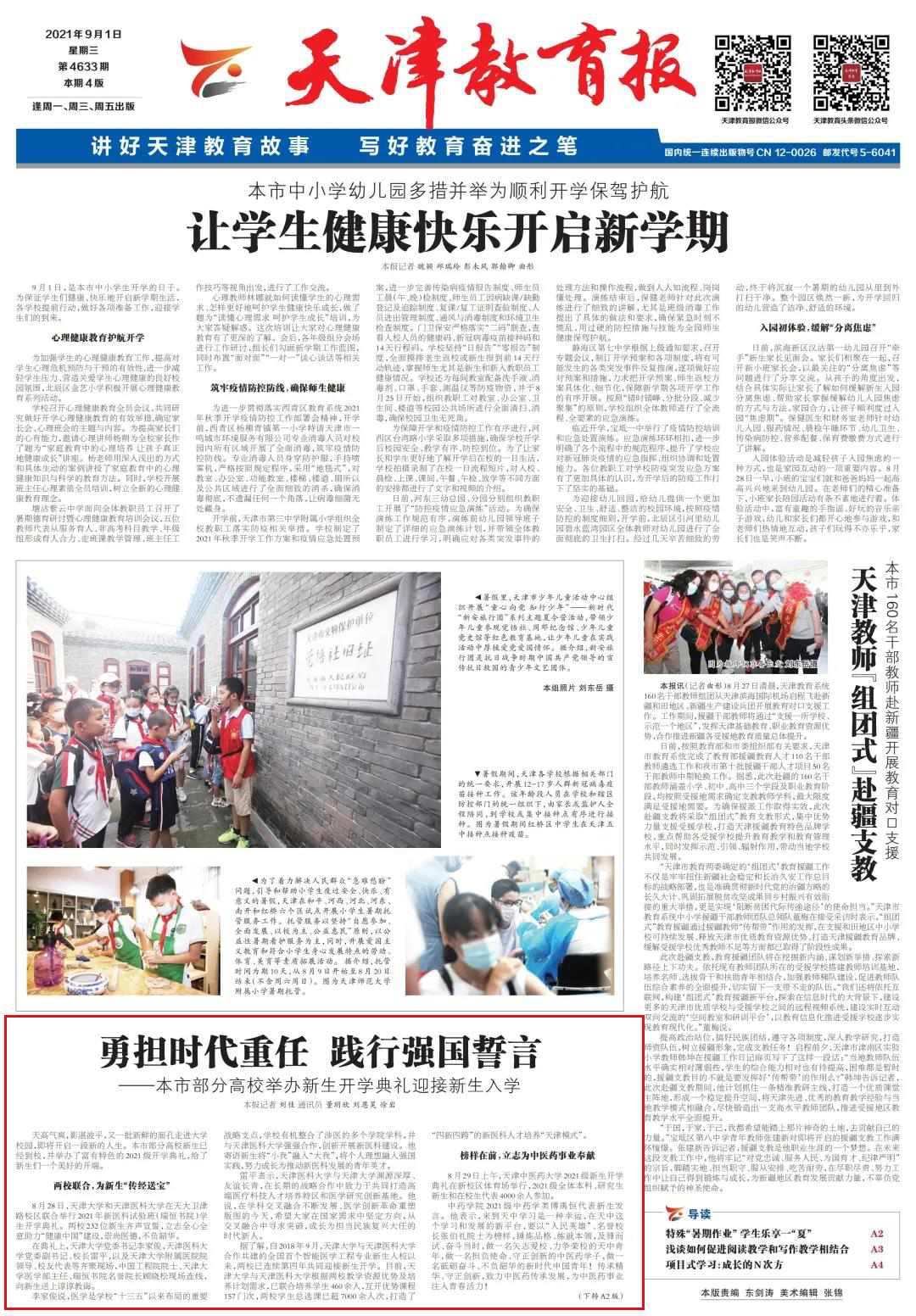 8月28日,天津大学和天津医科大学在天大卫津路校区联合举行2021年新医科试验班(瑞恒书院)学生开学典礼。两校232位新生齐声宣誓,立志全心全意助力“健康中国”建设,崇尚医德,不负韶华。