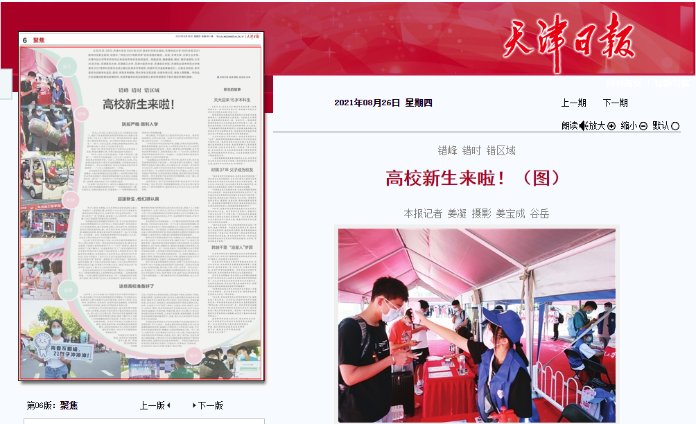 8月25日、26日,天津大学近5000名2021级本科生新生报到,天津财经大学4800余名2021级本科生新生报到,校园中,“欢迎2021级新同学”的标语格外醒目。此前,天津大学、天津工业大学、天津科技大学等多所学校已有其他年级学生陆续返校。根据安排,遵循错峰、错时、错区域原则,8月26日开始,天津医科大学、新葡萄AMG官方网站、天津中医药大学、天津音乐学院、天津职业技术师范大学等高校2021级本科生新生也将分期分批有序开学报到,校园中又洋溢起青春活力。记者走访发现,多所高校为迎接学生返校、报到,采取多种措施,简化学生注册流程,合理布局分区,避免人群聚集。学校全方位保障迎新期间疫情防控,也用丰富多彩的迎新服务让新同学感受到了新环境的热情和温暖。