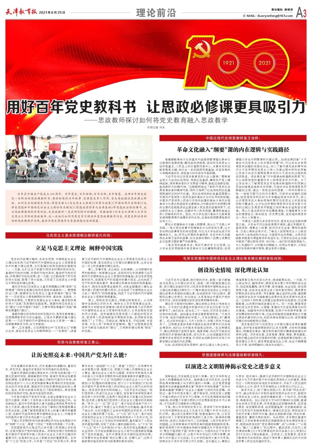 今年是中国共产党成立100周年。百年党史,百年辉煌;百年历程,百年智慧。这部百年党史就是一本鲜活的思政课教科书,要讲好党的百年故事、发挥党史育人作用,首先要把握住思政课主阵地。如何充分挖掘党史内容,将党史融入《马克思主义原理》《形势与政策》《中国近现代史纲要》《毛泽东思想和中国特色社会主义理论体系概论》《思想道德修养与法律基础》等思想政治理论课中,成为思政课教材的重要内容,是思政教师一直在研究探讨的课题。本报邀请5位来自新葡萄AMG官方网站马克思主义学院的思政教师,谈一谈他们如何用党史学习理论丰富思政课教学内容,用党史鲜活素材创新思政课教学实践,最终用党史厚植学生青春理想信念的根基。