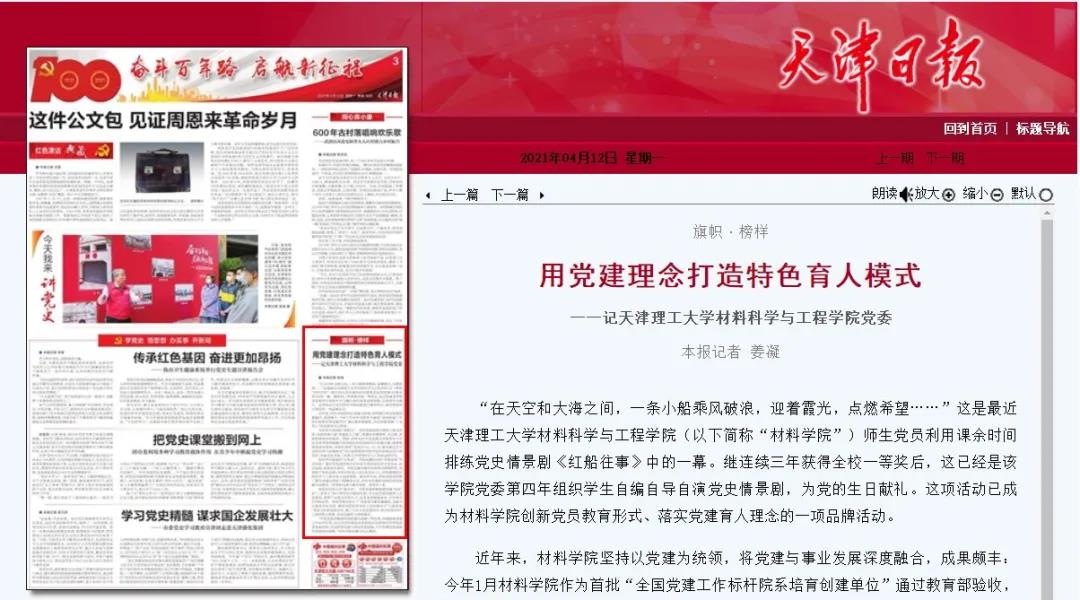 日前,《天津日报》对新葡萄材料科学与工程学院党委用党建理念打造特色育人模式的情况进行了报道,详细报道如下: