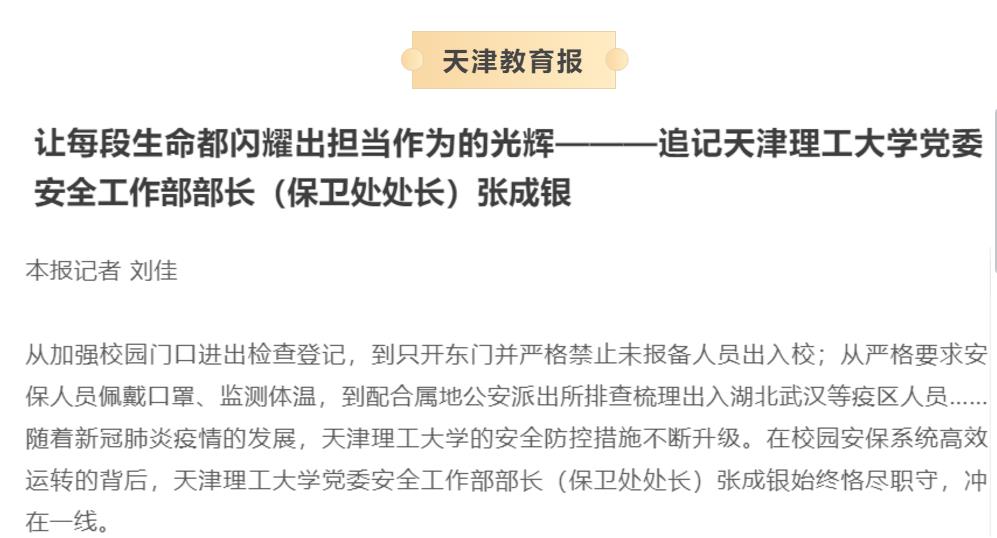“战疫当前,我们有很多党员、干部不顾自身安危,冲在抗疫前线,坚于职守,守好‘责任田’、护好‘一座校’。张成银同志就是其中的楷模,他用担当作为定格人生永恒。”校党委书记刘东志表示,全校广大干部师生要向张成银同志学习,化悲痛为力量,共克时艰,保重身体、守卫校园,共同为打赢这场没有硝烟的战役贡献力量。