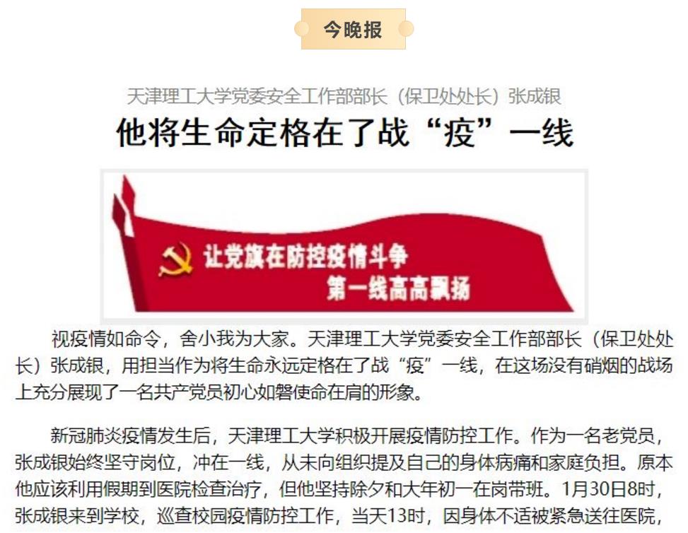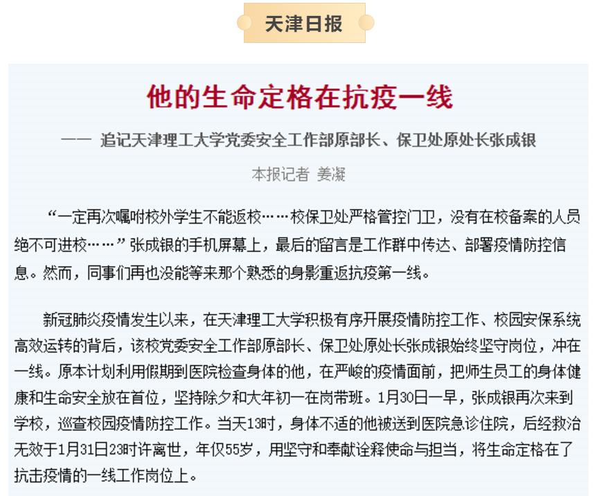 市委决定,对新冠肺炎疫情发生以来坚决响应党中央和习近平总书记号召,全力以赴投身抗疫斗争,以挺身而出、冲锋在前、英勇奋战、舍生忘死的实际行动,构筑起守护人民群众生命安全和身体健康严密防线的先进典型进行表彰。新葡萄张成银同志被追授“天津市优秀共产党员”称号。