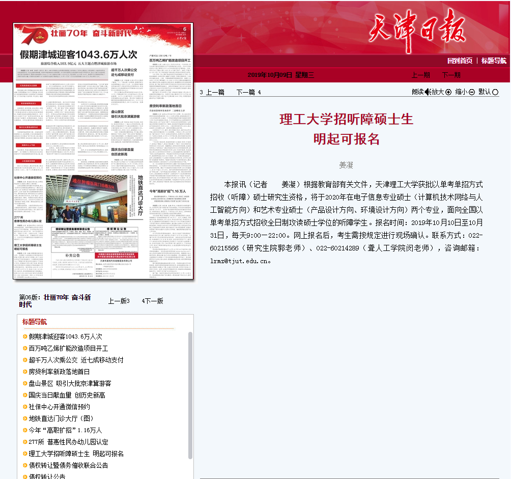 本报讯(记者 姜凝)根据教育部有关文件,新葡萄AMG官方网站获批以单考单招方式招收(听障)硕士研究生资格,将于2020年在电子信息专业硕士(计算机技术网络与人工智能方向)和艺术专业硕士(产品设计方向、环境设计方向)两个专业,面向全国以单考单招方式招收全日制攻读硕士学位的听障学生。报名时间:2019年10月10日至10月31日,每天9:00—22:00。网上报名后,考生需按规定进行现场确认。联系方式:022-60215566(研究生院郭老师)、022-60214289(聋人工学院闵老师),咨询邮箱:lrmz@tjut.edu.cn。