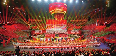 华彩乐章,歌颂祖国。演出最后,全场万人高唱《歌唱祖国》,一同歌唱我们亲爱的祖国,走向繁荣富强。巨大的震撼力、感染力让每个人心潮澎湃。